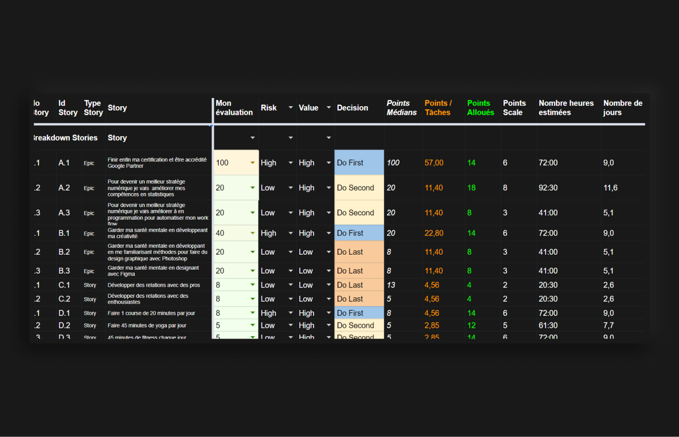 Pour faciliter le pointage, je vais multiplier par 10 le nombre de points par tâche. Quand je fais le suivi dans l’échéancier, je diviserai le total par 10, pour calculer le nombre de points réalisés et la vélocité.